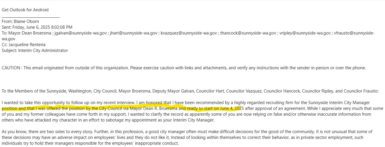 “Prior to my interview with the City of Sunnyside the mayor told me the job was mine. So I thought it was just a matter of the council approving my appointment. I was ready to start,” said Oborn.
