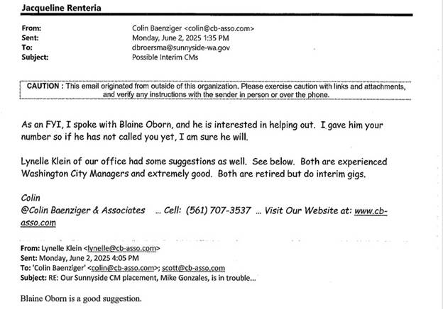 On June 2nd, the day that Gonzalez was placed on leave, City Clerk Jacqueline Renteria and Mayor Dean Broersma exchanged emails with Colin Baeziger and Associates on possible candidates, including Blain Oborn. Keep in mind, Gonzalez had not received any notice that he would be put on “paid administrative leave for non-disciplinary actions”. Gonzalez had also just received a solid performance review.