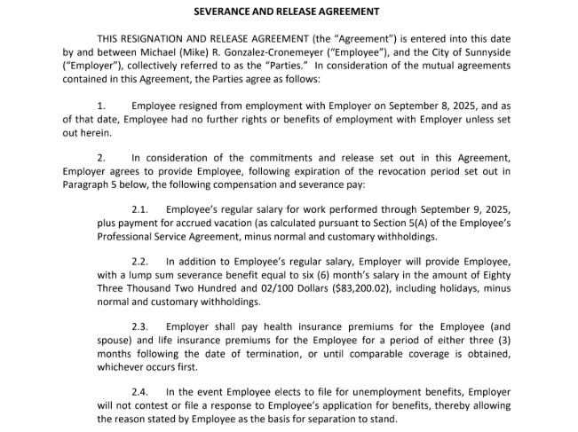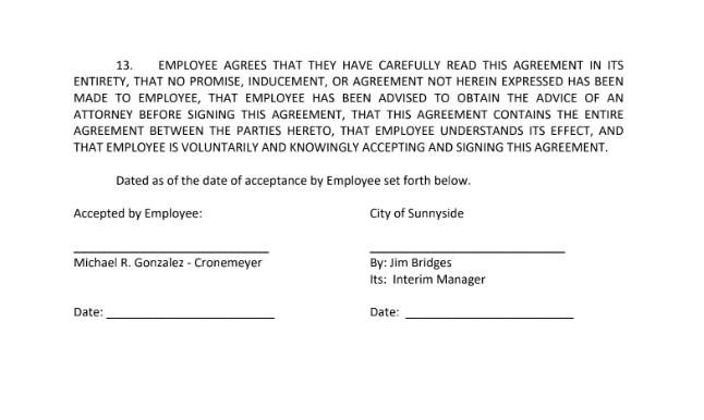 Según fuentes creíbles dentro de la Ciudad de Sunnyside, el Concejo Municipal ofreció al Administrador Municipal Mike Gonzalez casi $100,000 en liquidación y beneficios el 28 de agosto — apenas tres días después de haber sido informados de que los resultados de una investigación interna eran un fracaso y no había nada con qué despedirlo “con causa justificada.”