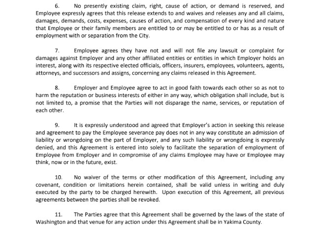 A cambio, se le habría exigido a Gonzalez renunciar a su derecho de demandar a la ciudad y emitir un comunicado de prensa escrito exonerando a la concejala Theresa Hancock de cualquier irregularidad en su denuncia de acoso.